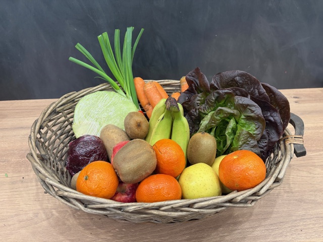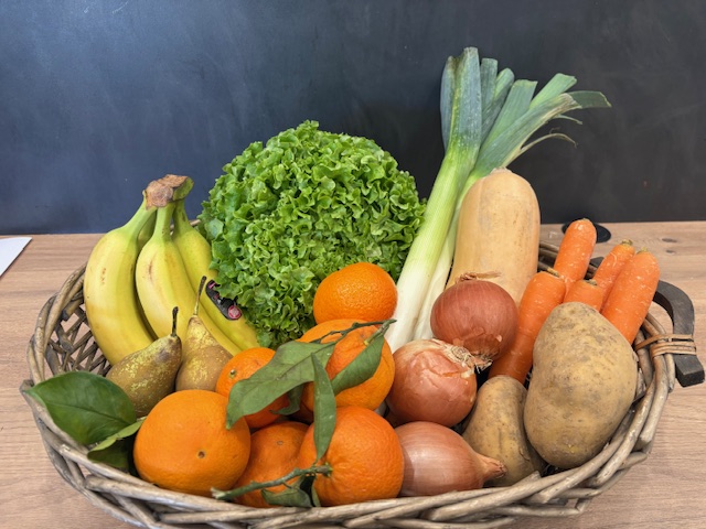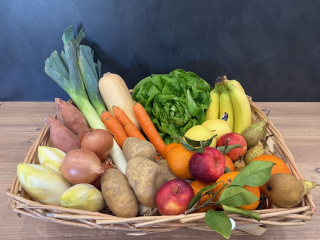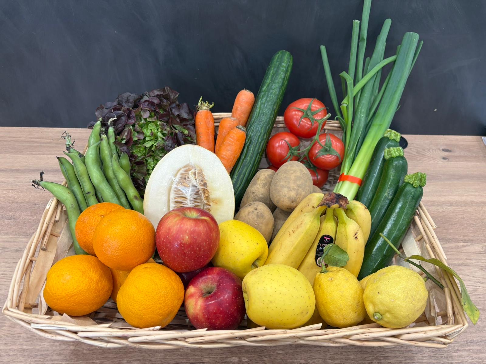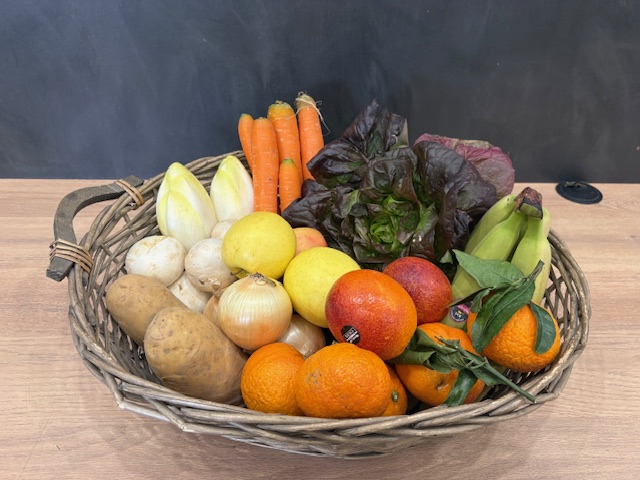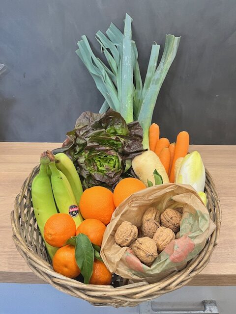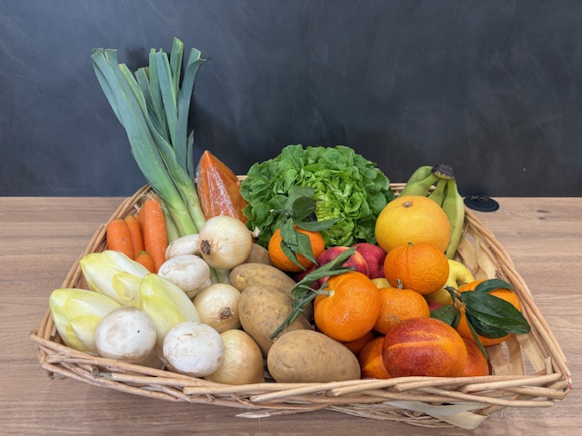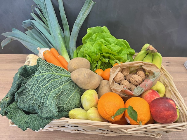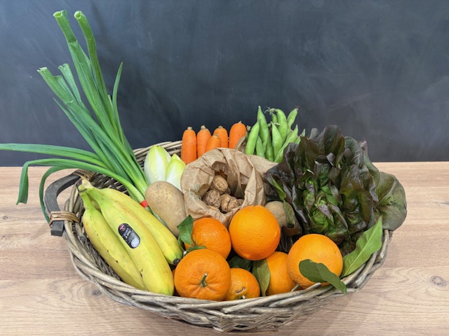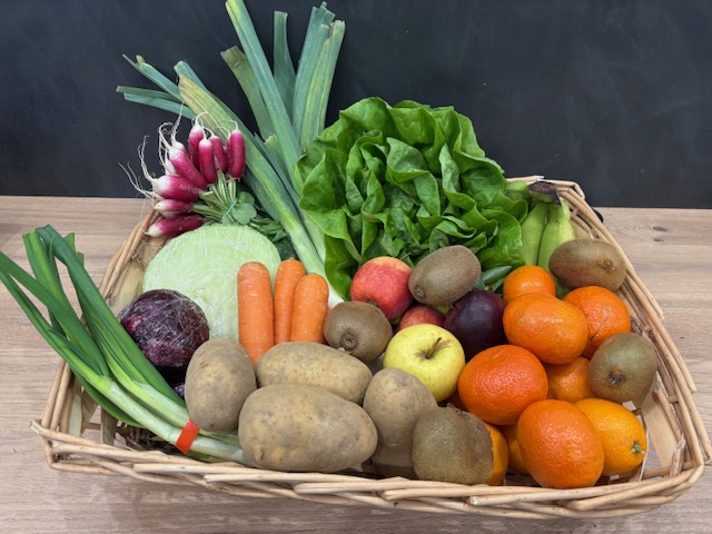 Panier de fruits et légumes locaux de saison, épicerie fine, fruits et légumes, agriculture raisonnée, fromages et charcuterie AOP à la coupe