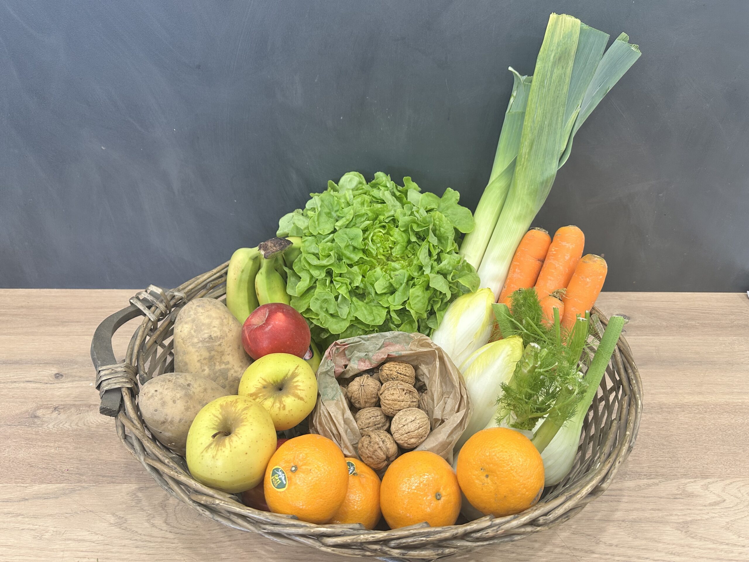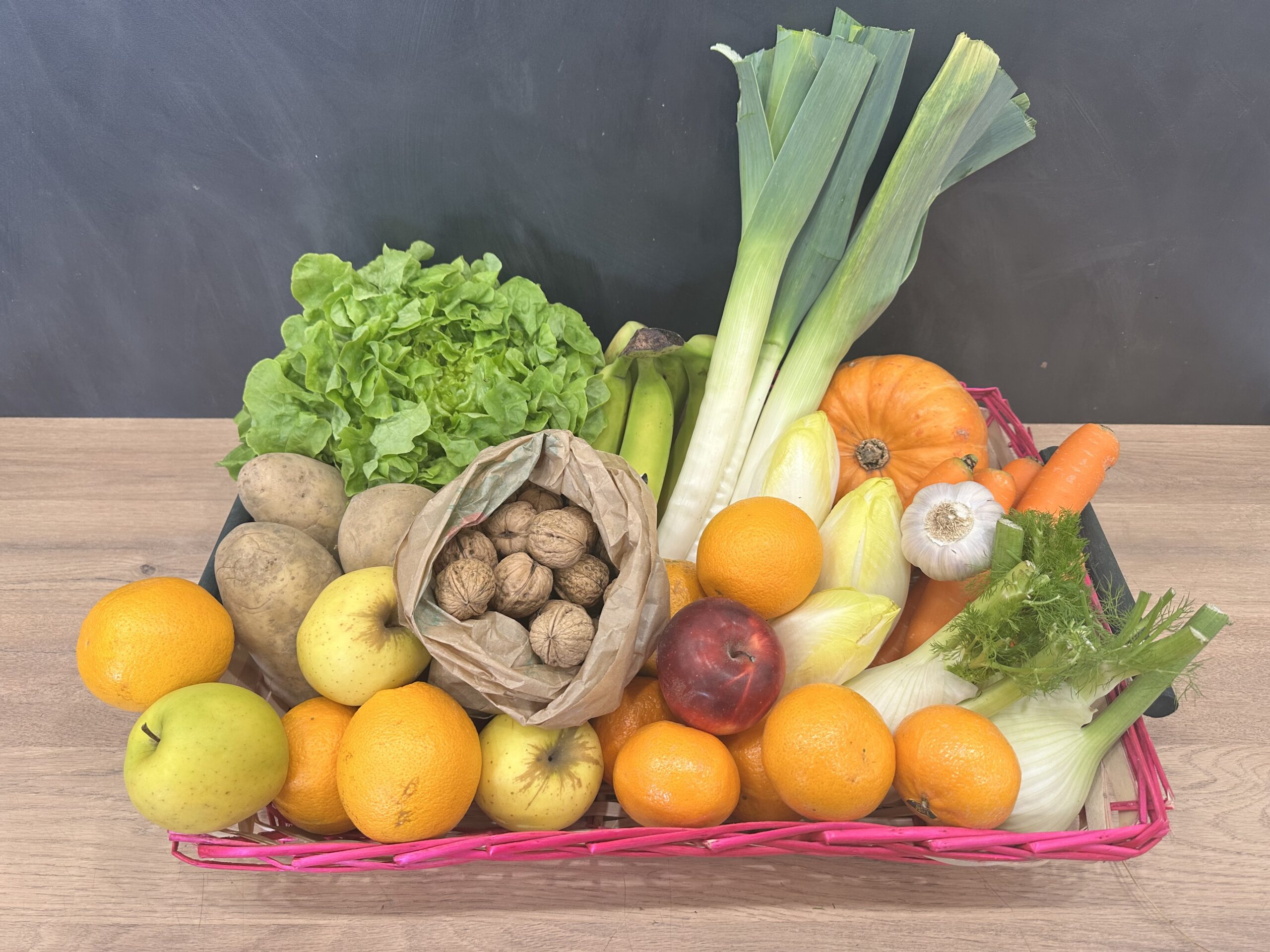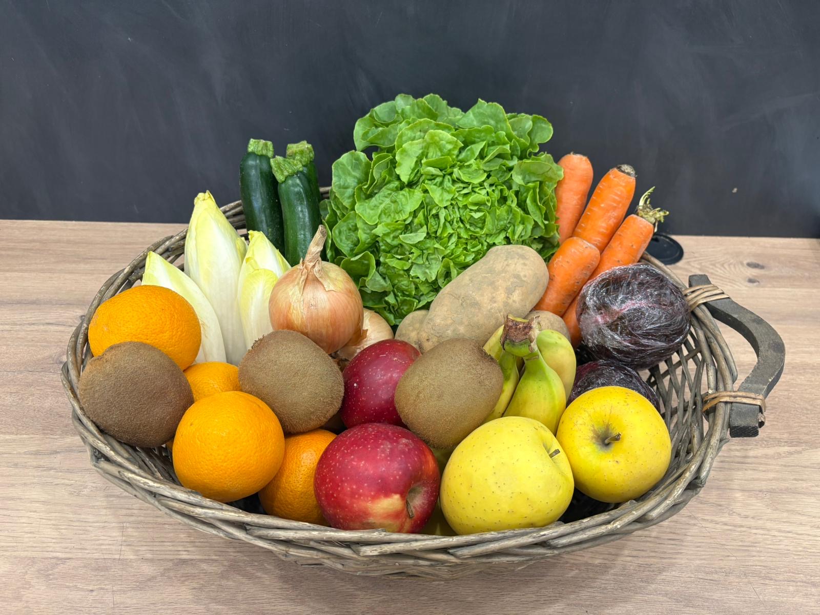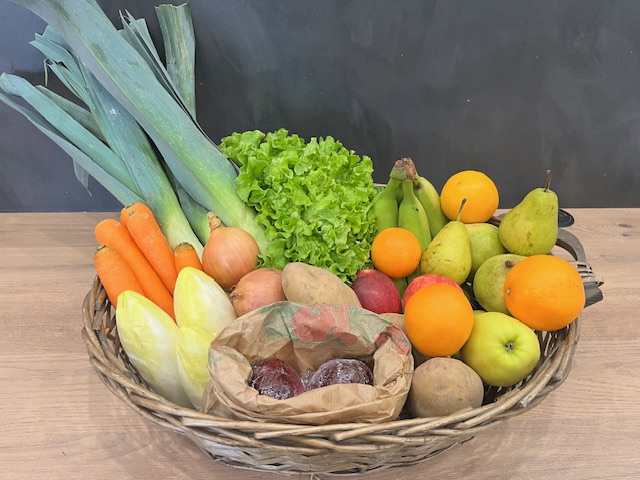 Panier de fruits et légumes locaux de saison, épicerie fine, fruits et légumes, agriculture raisonnée, fromages et charcuterie AOP à la coupe